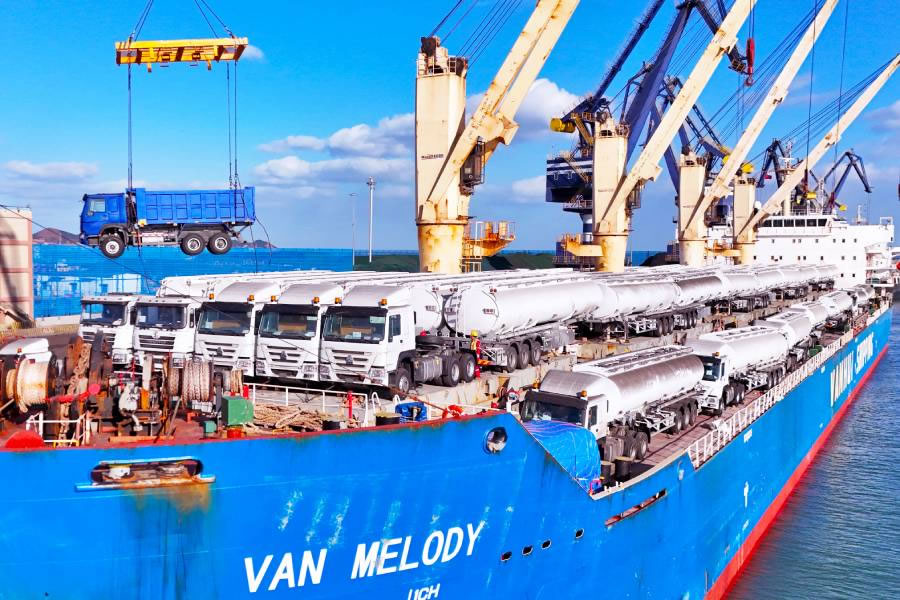Des ouvriers chargent des camions destinés à l’exportation vers l’Afrique dans le port de Yantai, dans la province chinoise du Shandong. (Photo : AFP/CN-STR)